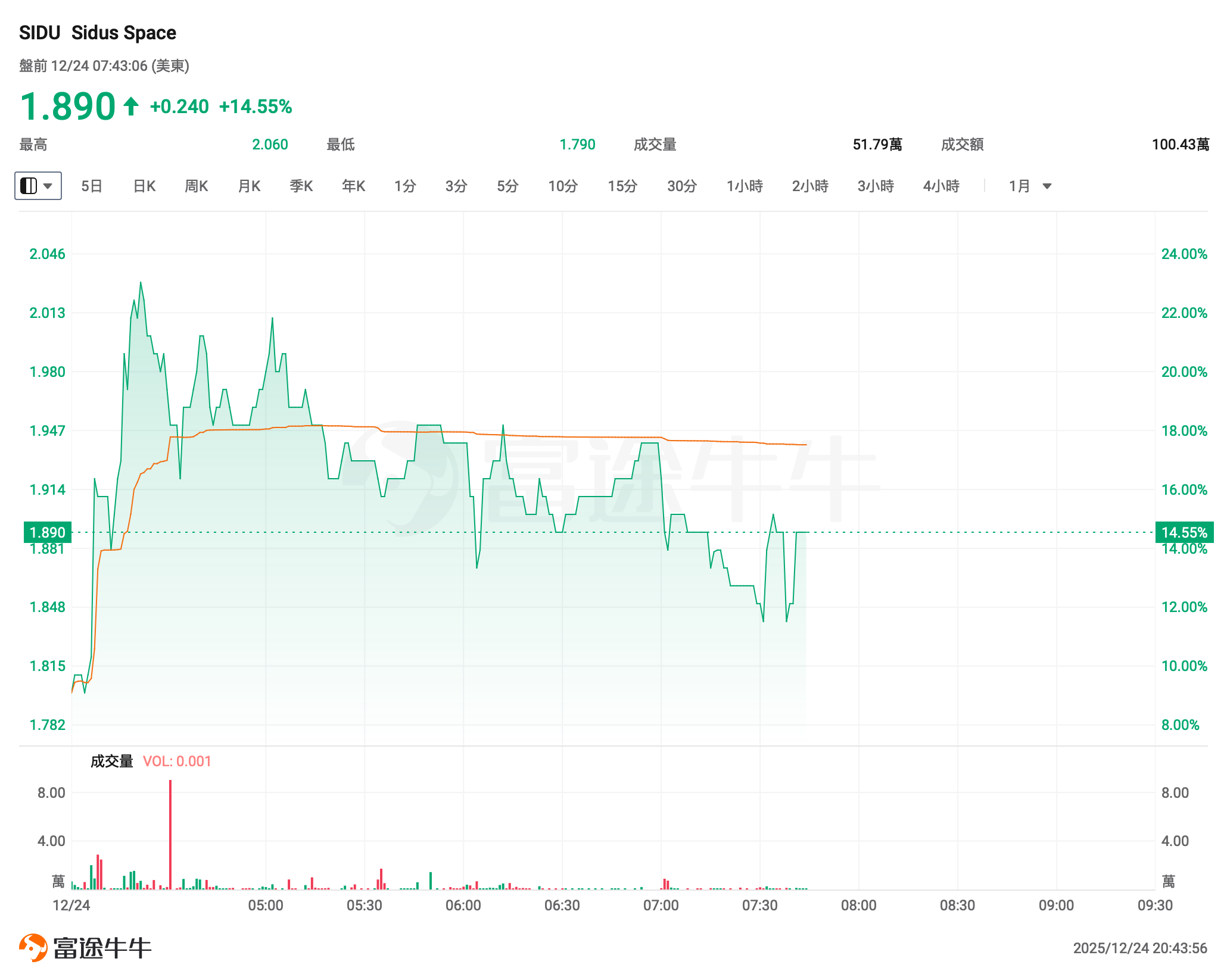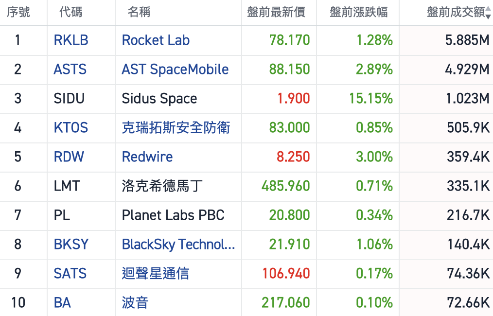$太空概念(LIST2556.US)$ 盘前普涨, $Sidus Space(SIDU.US)$ 涨超15%, $Redwire(RDW.US)$ 、$AST SpaceMobile(ASTS.US)$涨近3%。