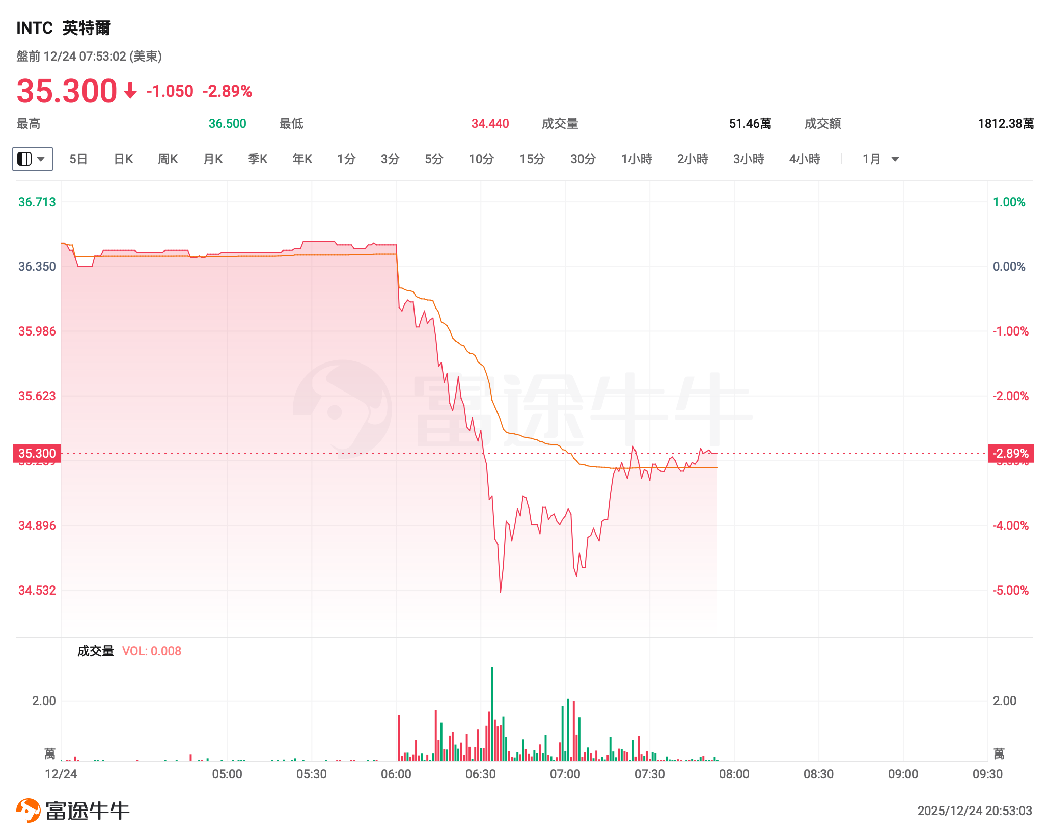 英特尔盘前跳水一度跌逾5%,消息称英伟达暂停测试其18A制程工艺