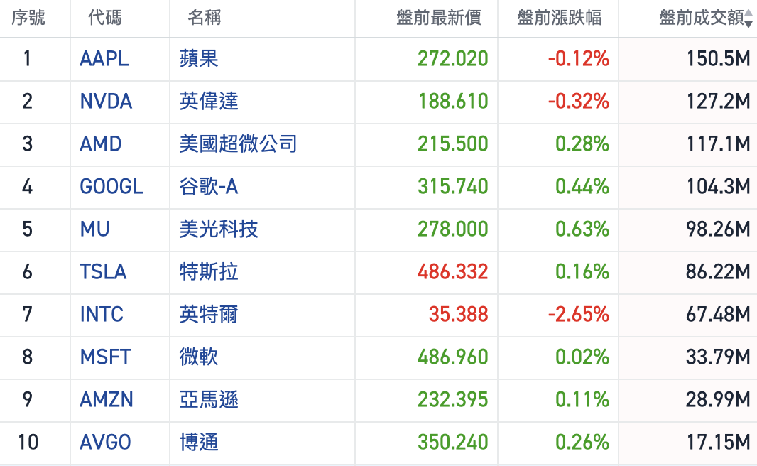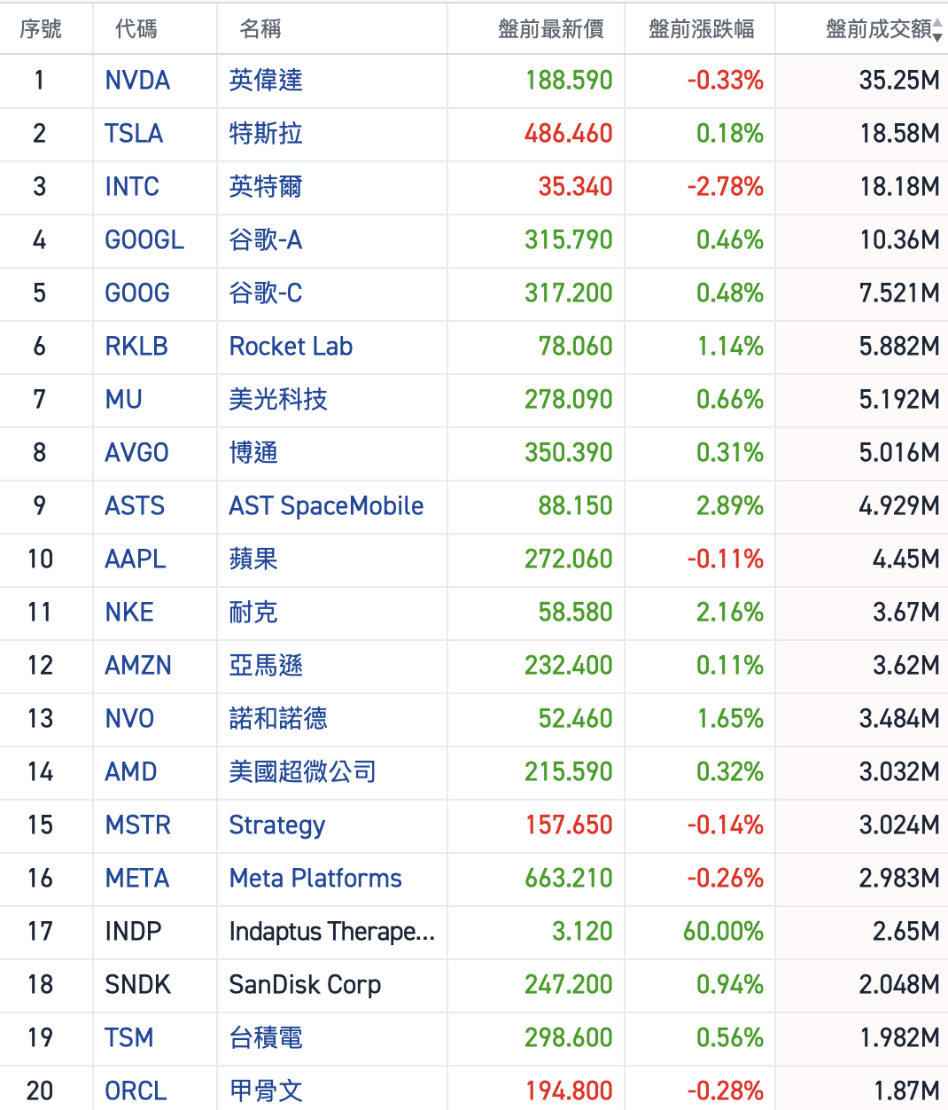 $明星科技股(LIST2518.US)$ 盘前涨跌不一, $英特尔(INTC.US)$ 跌超2%。