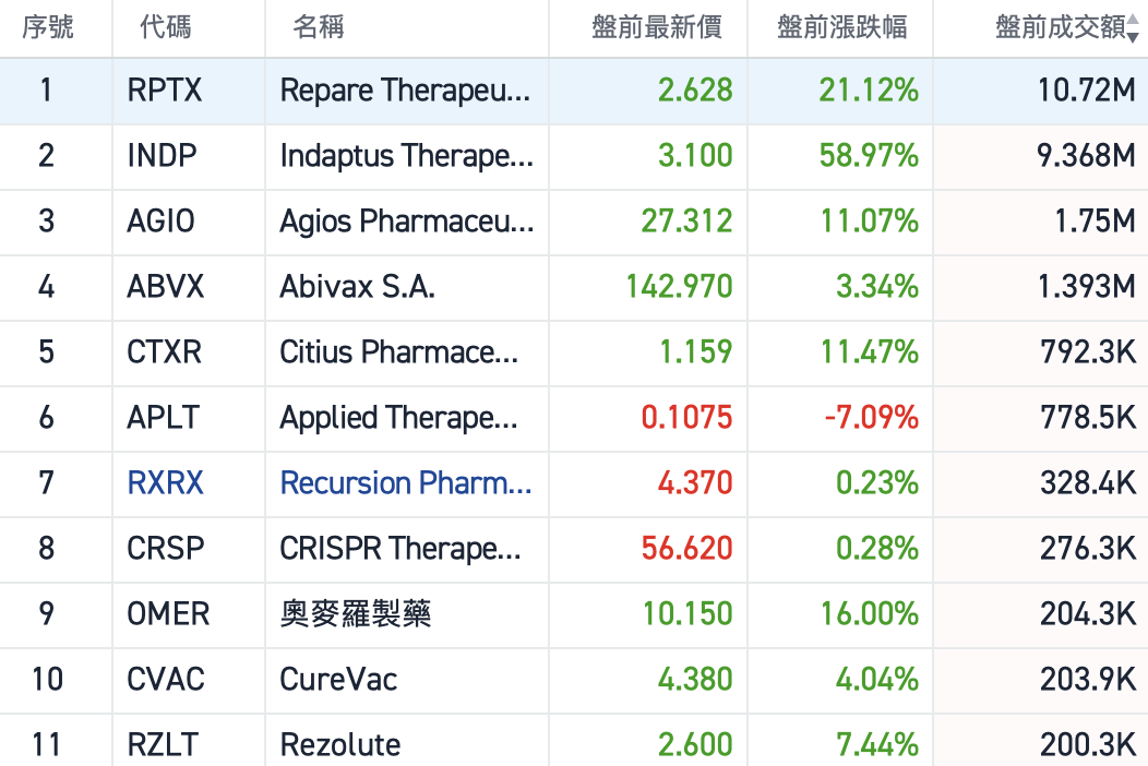 $生物技术(LIST2069.US)$ 板块盘前涨幅居前。 $Indaptus Therapeutics(INDP.US)$ 涨超58%, $Repare Therapeutics(RPTX.US)$ 涨超21%, $Agios Pharmaceuticals(AGIO.US)$ 、 $Citius Pharmaceuticals(CTXR.US)$ 涨超11%, $奥麦罗制药(OMER.US)$ 涨超16%。