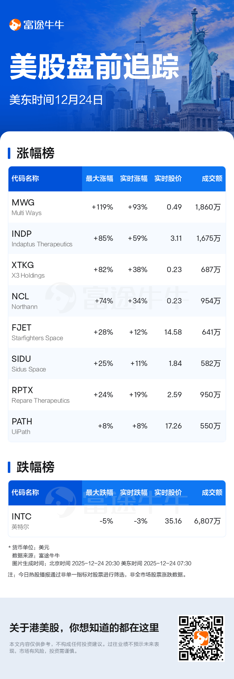 美东时间12月24日报道,以下为今日美股盘前热门个股。