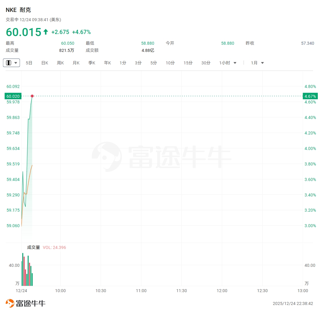 在 $苹果 (AAPL.US)$ CEO蒂姆·库克本人买入了价值近300万美元的 $耐克 (NKE.US)$ 股票后,耐克股价在周三的美股盘初拉升,现涨近5%。