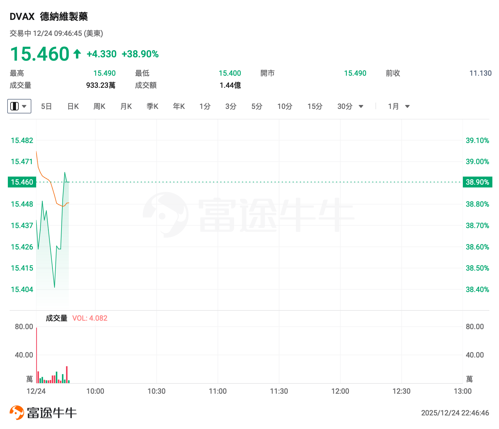 $德纳维制药 (DVAX.US)$ 暴涨近39%。消息面上, $赛诺菲安万特 (SNY.US)$ 同意以约22亿美元的价格收购德纳维制药,旨在扩充其目前以流感疫苗业务为核心的疫苗产品线。根据赛诺菲周三发布的声明,其将以每股15.50美元的现金价格,收购总部位于美国加利福尼亚州埃默里维尔市的德纳维制药。这一报价较达德纳维制药周二的收盘价溢价39%。