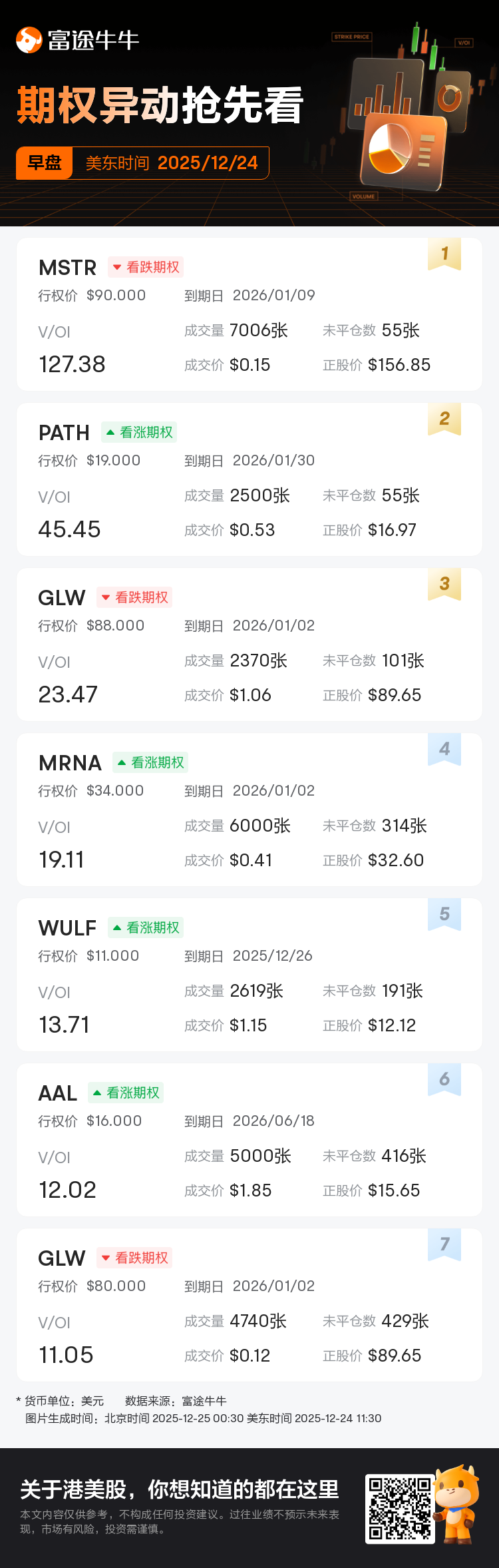 若在对应时段有超过3笔V/OI≥10的交易,将在美东时间11:30、13:30和16:30各生成一篇期权异动资讯。