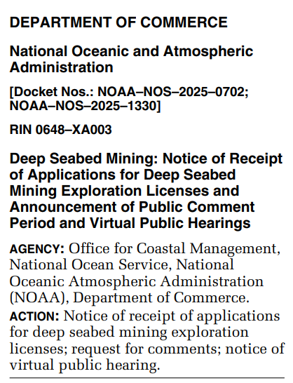 美国国家海洋与大气管理局(NOAA)本周发布公告称,拟定于下个月底就加拿大$TMC the metals (TMC.US)$提交的国际水域深海采矿申请举行公开在线听证会。