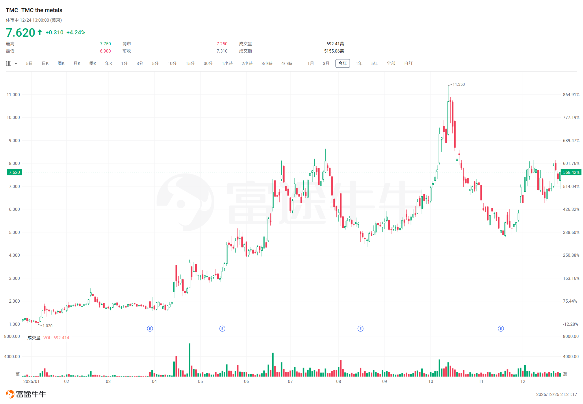 话虽如此,在“概念尚未落地”的时刻,资本市场仍在热炒深海采矿概念。以在美上市的$TMC the metals (TMC.US)$为例,这只没有任何营收的股票,今年经历多轮起伏后仍录得580%的疯狂涨幅。