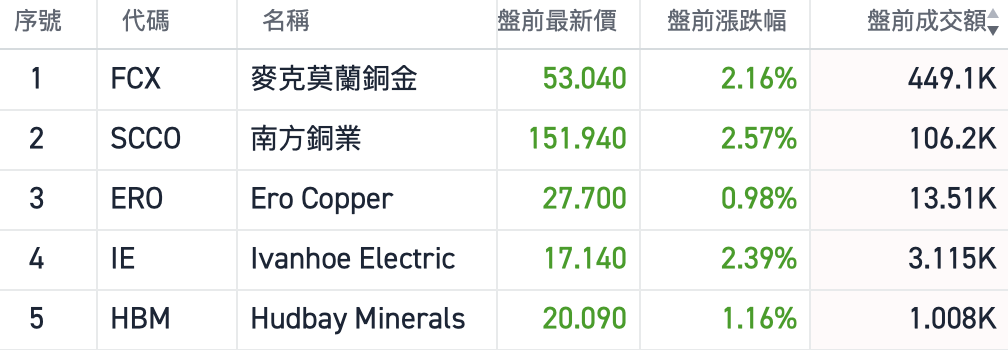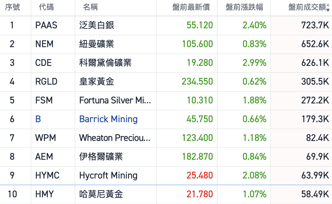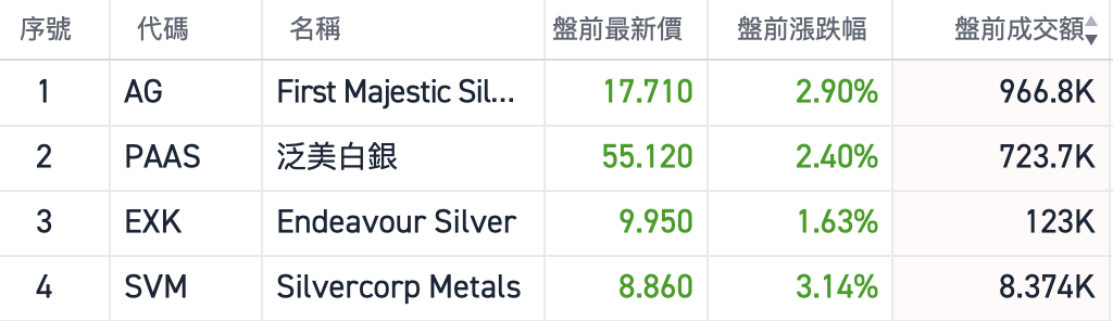 金银铜创下新高后, $黄金(LIST2110.US)$ 、 $白银(LIST2093.US)$ 、 $铜(LIST2510.US)$ 盘前上涨。 $科尔黛伦矿业(CDE.US)$ 涨近3%, $泛美白银(PAAS.US)$ 、 $Hycroft Mining(HYMC.US)$ 涨超2%; $Silvercorp Metals(SVM.US)$ 涨超3%。