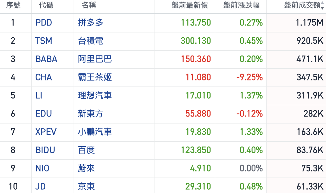 $热门中概股(LIST2517.US)$ 盘前涨跌不一, $霸王茶姬(CHA.US)$ 盘前跌超9%, $理想汽车(LI.US)$ 、 $小鹏汽车(XPEV.US)$ 涨超1%。
