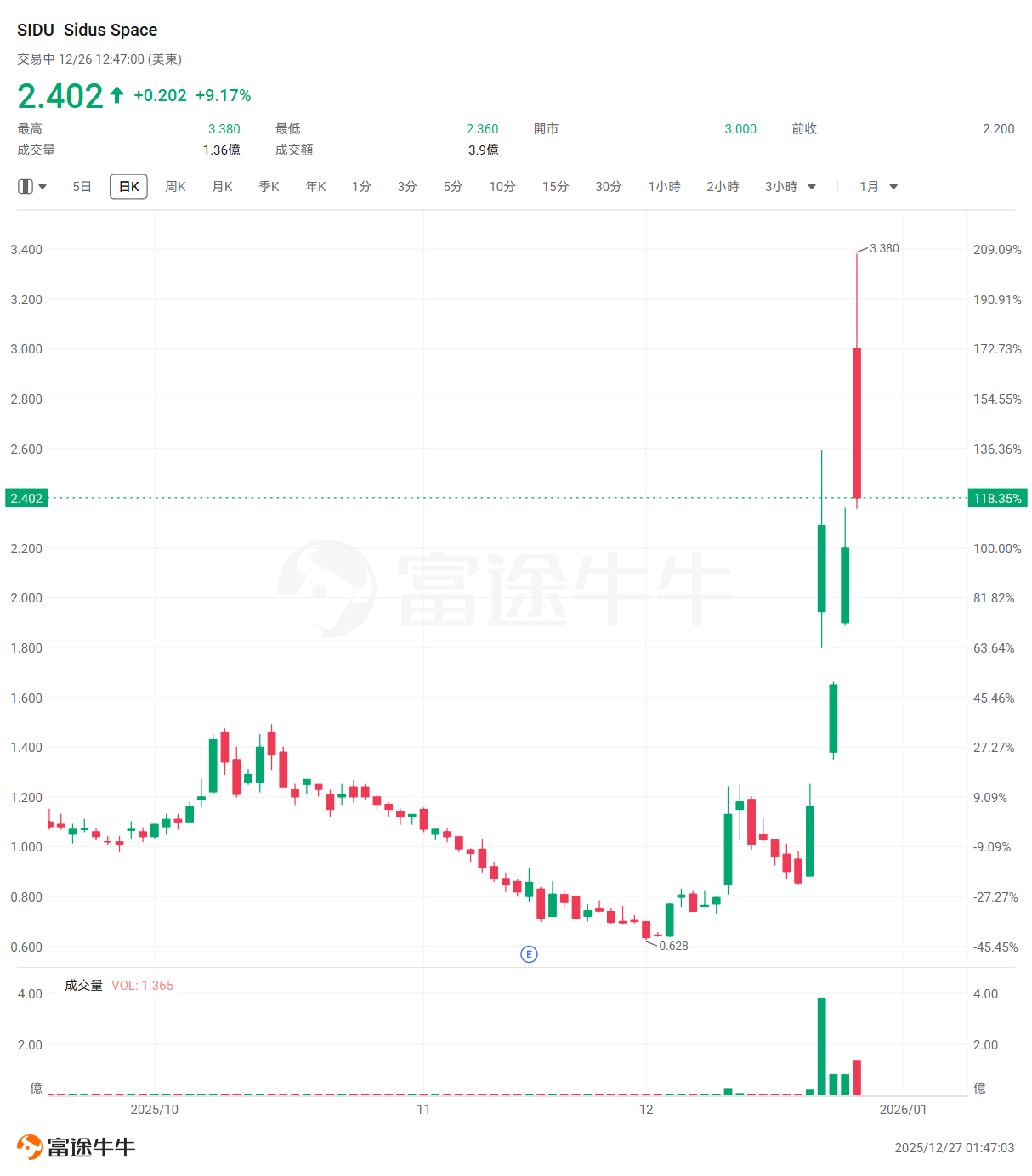 财联社12月27日讯(编辑 赵昊)周五(12月26日)美股早盘,太空概念股 $Sidus Space (SIDU.US)$一度涨超53%报每股3.38美元,创今年1月以来的最高水平。