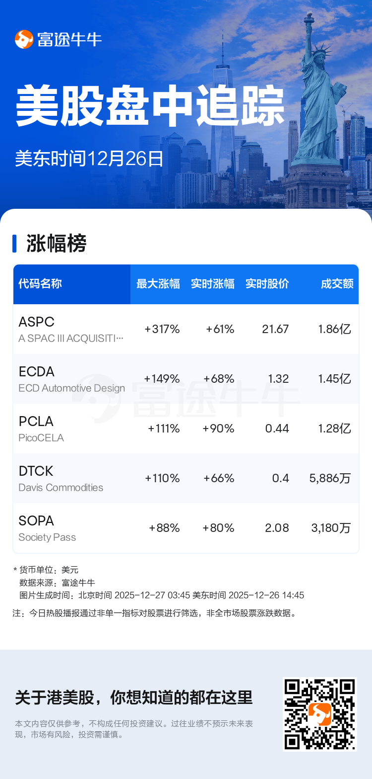 $A SPAC III ACQUISITION CORP (ASPC.US)$一度涨317.28%,现涨61.5%,报21.67美元,成交额达1.86亿美元。