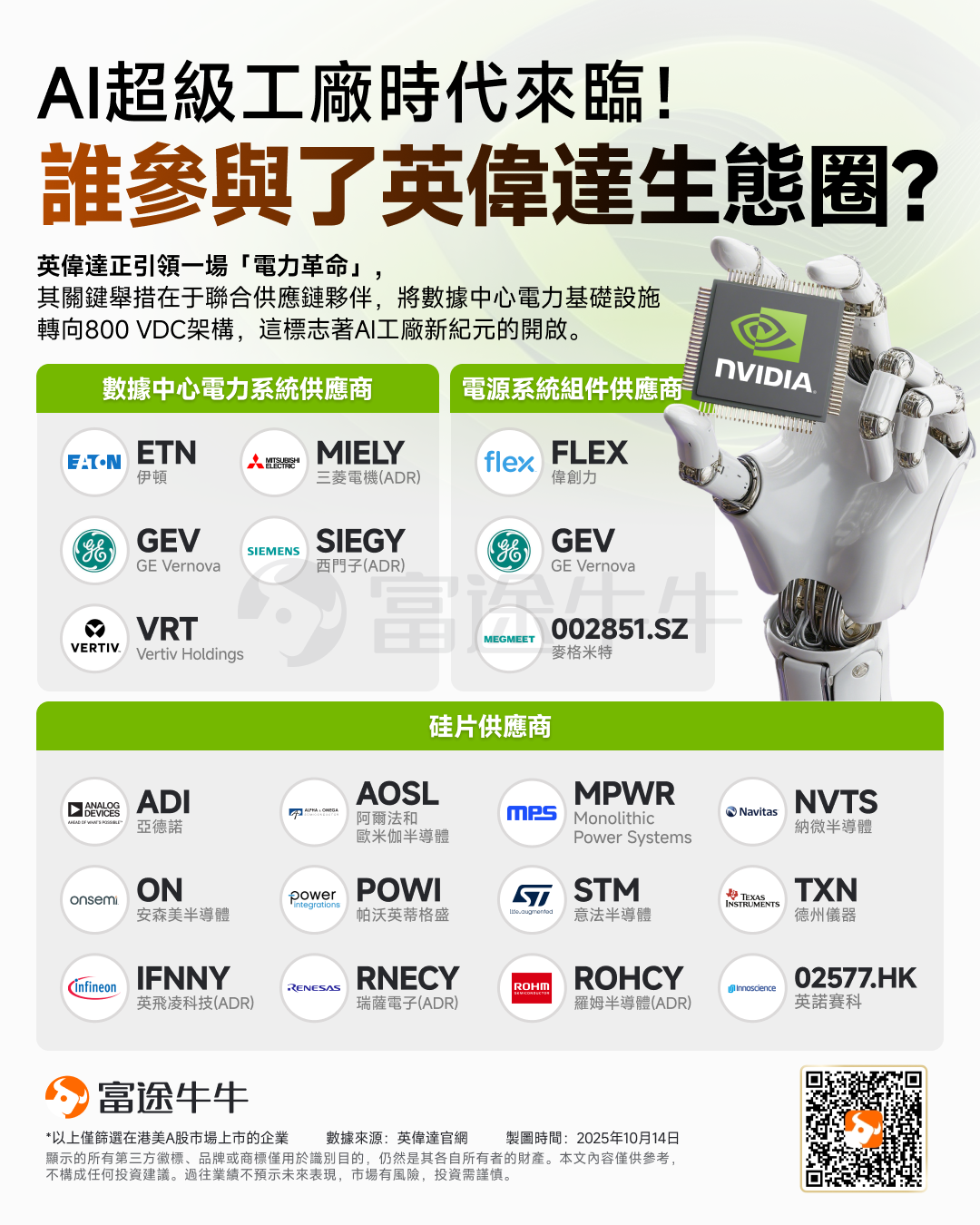 英伟达已于近期宣布了包括 $CoreWeave (CRWV.US)$ 、 $甲骨文 (ORCL.US)$ 在内的十余家合作伙伴,旨在为800伏直流电源架构和单机柜功率密度达到1兆瓦(MW)的超高密度计算环境做准备。这一转变是为了支持其下一代“Vera Rubin”架构及“Kyber”系统,后者预计于2027年面世,单机柜将集成576个GPU,其对电力和冷却系统的要求远远超出了当前415伏交流电架构的承载极限。