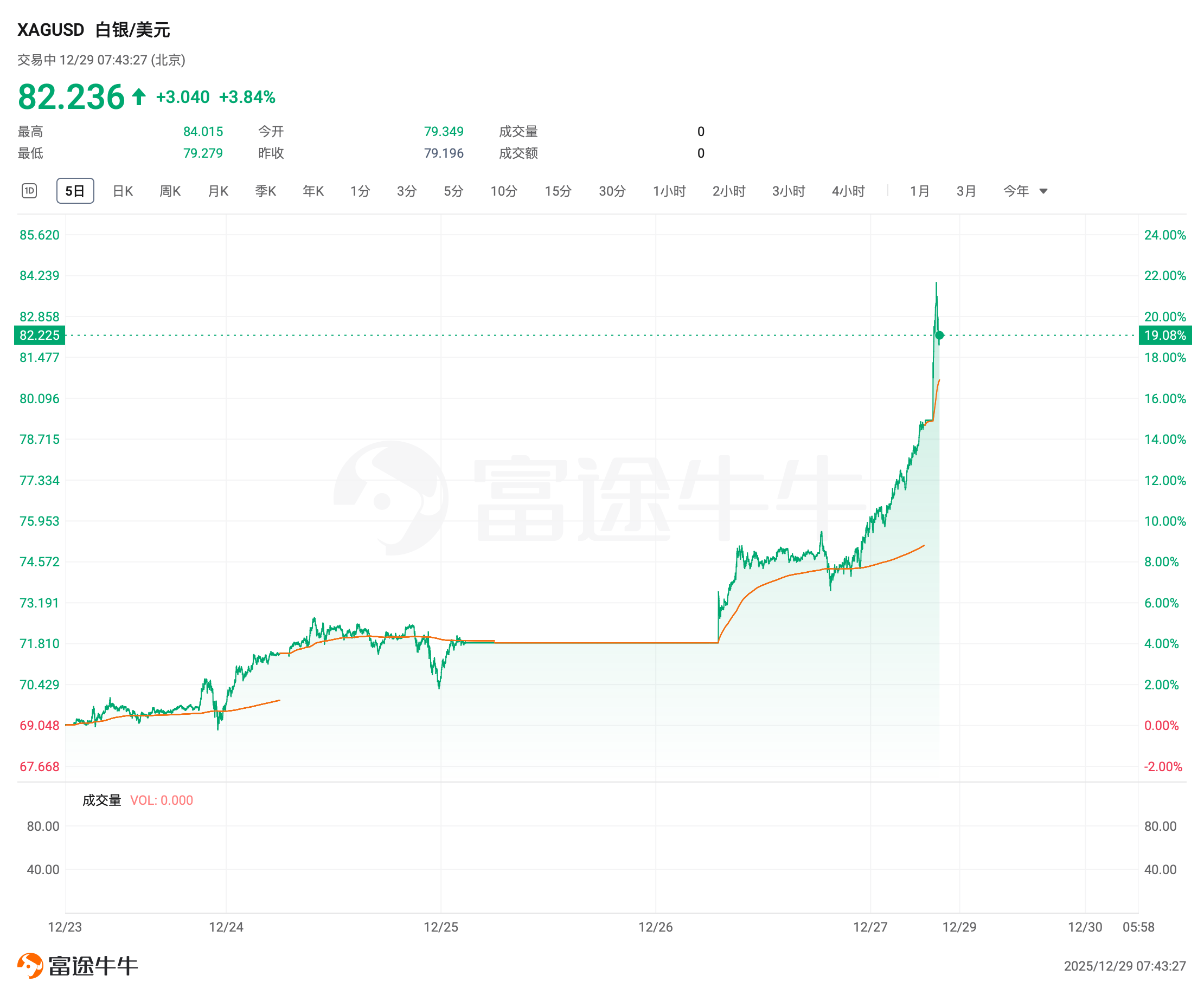 周一(12月29日),现货白银开盘暴力拉升,首次突破80美元/盎司关口, 并迅速突破83美元/盎司,日内涨幅超5%,今年累计涨幅扩大至52美元。同时,现货黄金周一高开逼近新高,随后有所回落,现报4538美元/盎司。