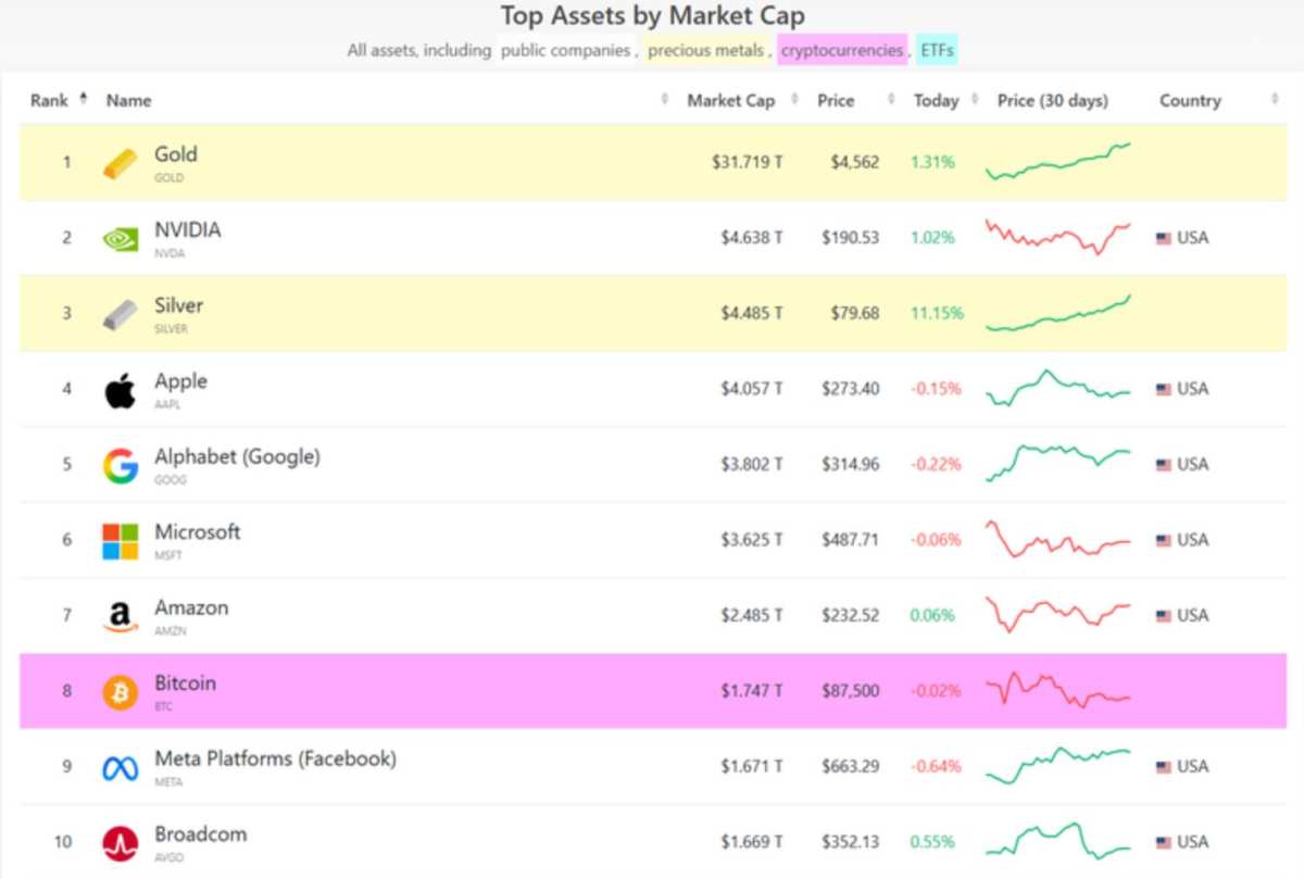 $白银/美元 (XAGUSD.FX)$ 今年暴涨超185%,一跃成为全球第三大最有价值资产,仅次于 $黄金/美元 (XAUUSD.CFD)$ 和 $英伟达 (NVDA.US)$ ,并将 $苹果 (AAPL.US)$ 、 $谷歌-A (GOOGL.US)$ 与 $微软 (MSFT.US)$ 等科技巨头甩在身后。