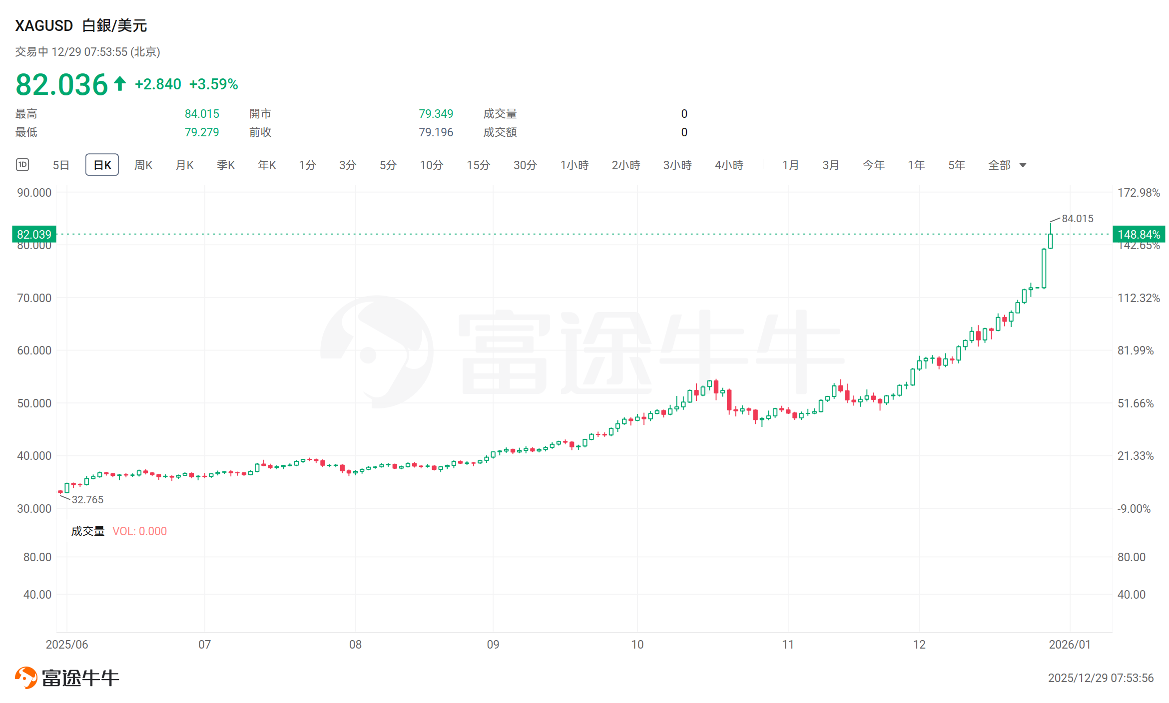 现货白银上周五盘中创下历史新高,达每盎司79.29美元,最终收于79.11美元;周一早盘延续强势上涨态势,首次突破84美元/盎司关口,年内累计涨幅已超过185%。