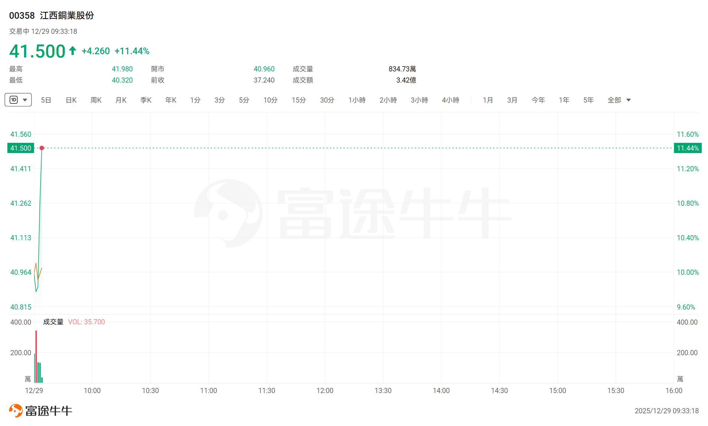今日, $江西铜业股份 (00358.HK)$ 高开近10%,截至发稿,涨11.44%,报41.5港元,成交额3.42亿港元。