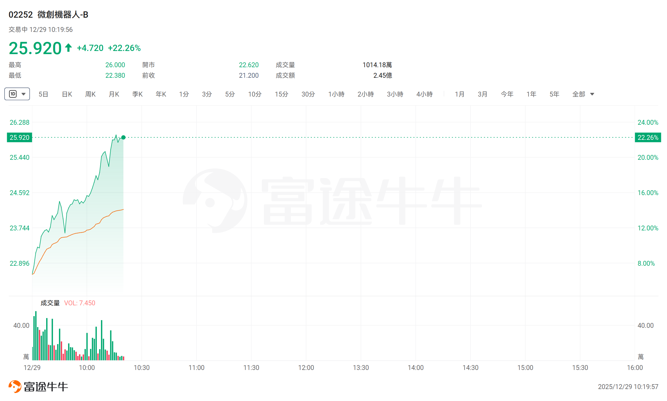 今日, $微创机器人-B (02252.HK)$ 涨超22%,截至发稿,涨22.26%,报25.92港元,成交额2.45亿港元。