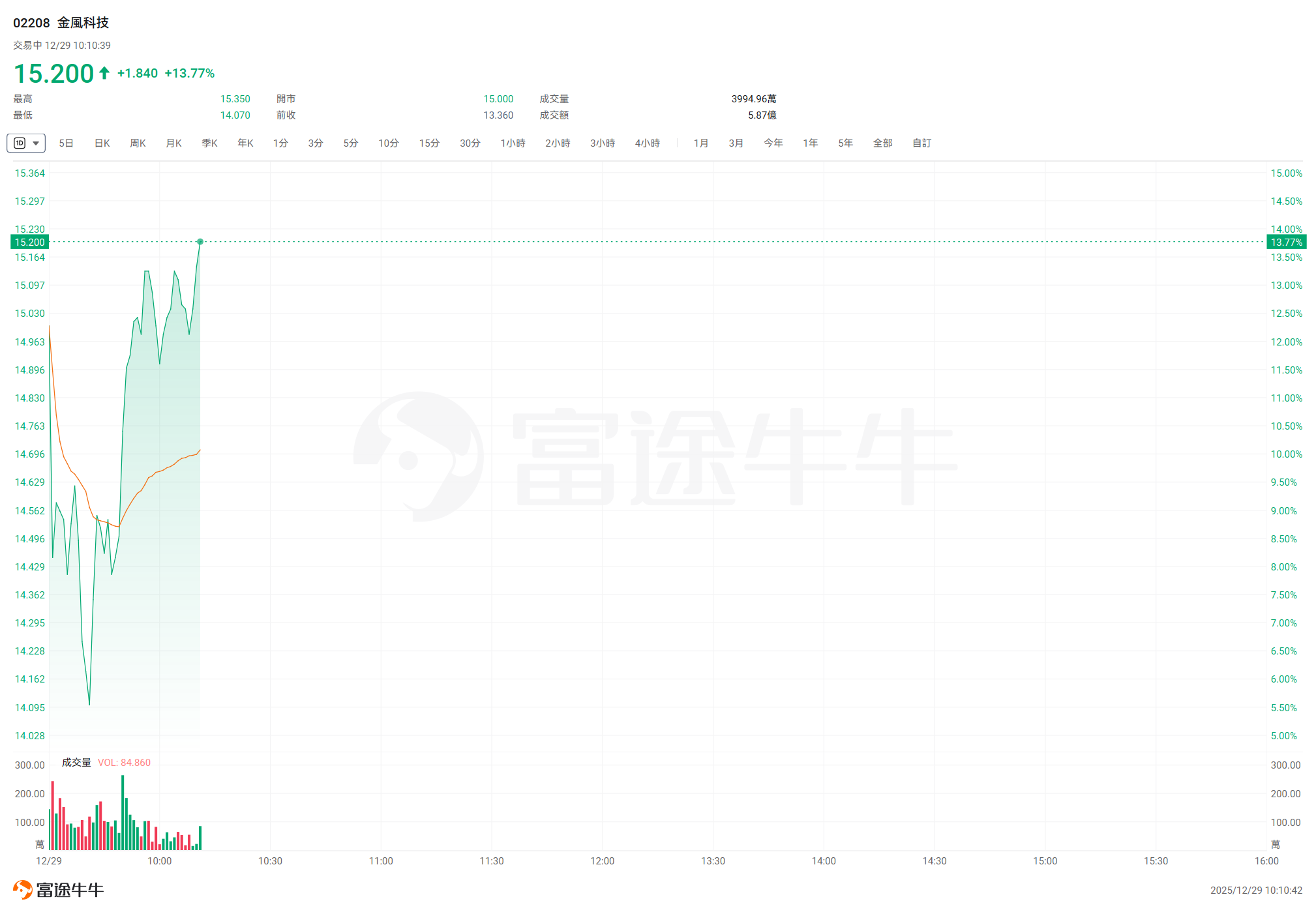12月29日消息,金风科技上午盘中涨幅扩大,截止发稿涨近14%,报15.2港元,成交额5.87亿港元。