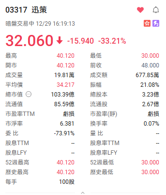 富途资讯12月29日消息, $迅策 (03317.HK)$ 暗盘现跌33.21%,报32.06港元,总市值超100亿港元,每手100股,不计手续费,一手蚀1594港元。