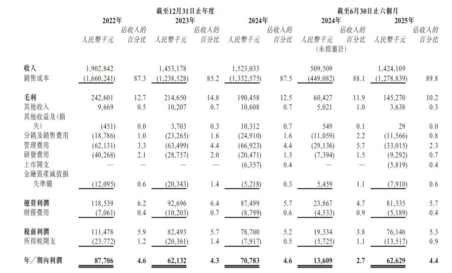 同年度/期间,公司的毛利分别为人民币242.6百万元、人民币214.7百万元、人民币190.5百万元、人民币60.4百万元和人民币145.3百万元,而公司的毛利率于相同年度/期间则分别为12.7%、14.8%、12.5%、11.9%和10.2%。