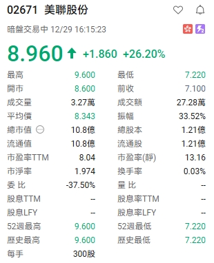 富途资讯12月29日消息, $美联股份 (02671.HK)$ 暗盘大幅高开,现涨26.2%,报8.96港元,每手300股,不计手续费,一手赚558港元。