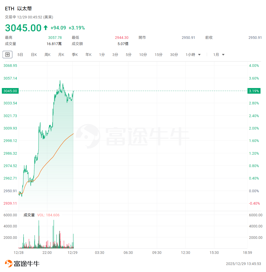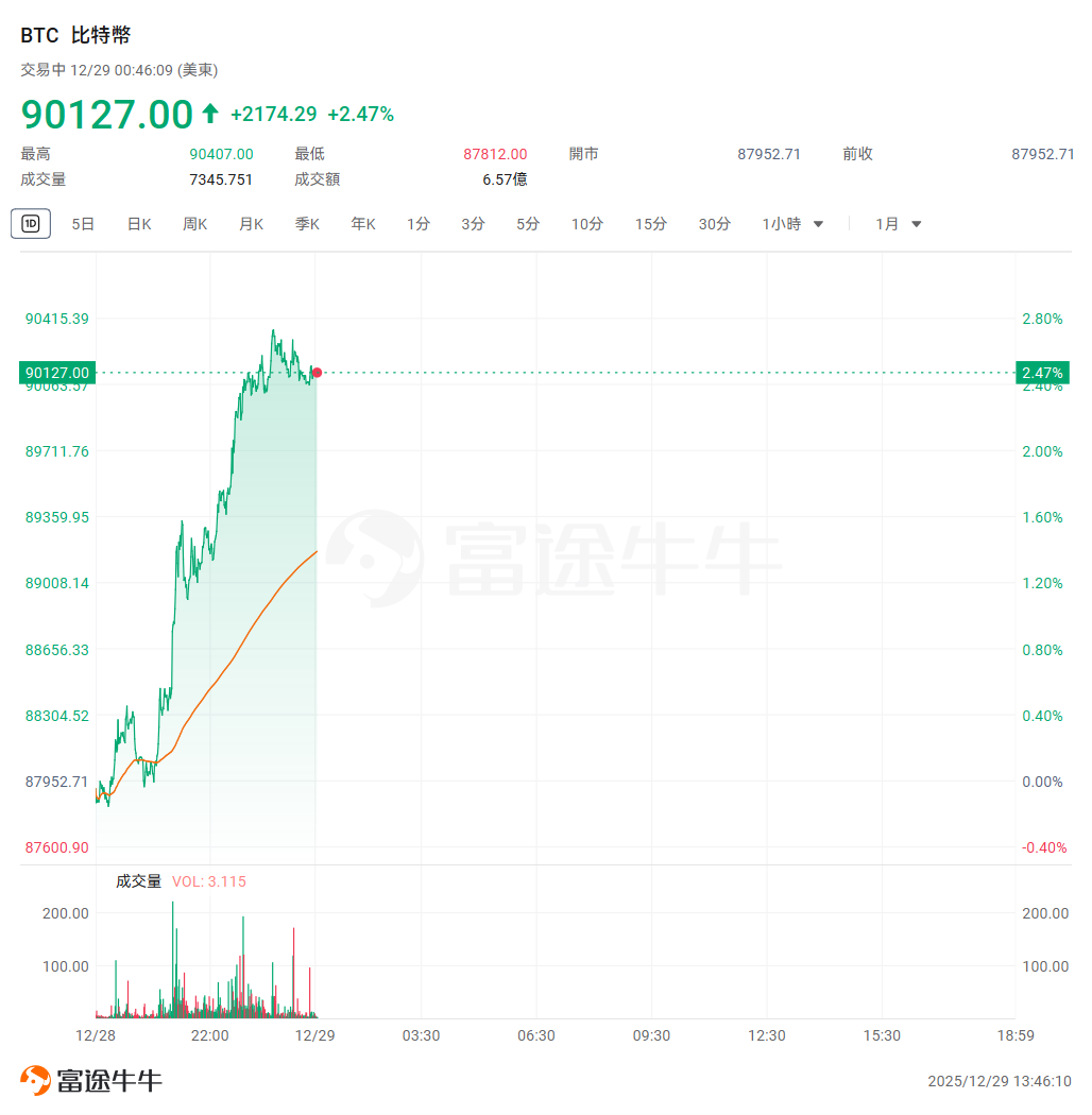 12月29日消息,加密货币市场震荡上行,截至发稿,$比特币 (BTC.CC)$涨2.47%,报90127美元;$以太坊 (ETH.CC)$涨3.19%,报3045美元。