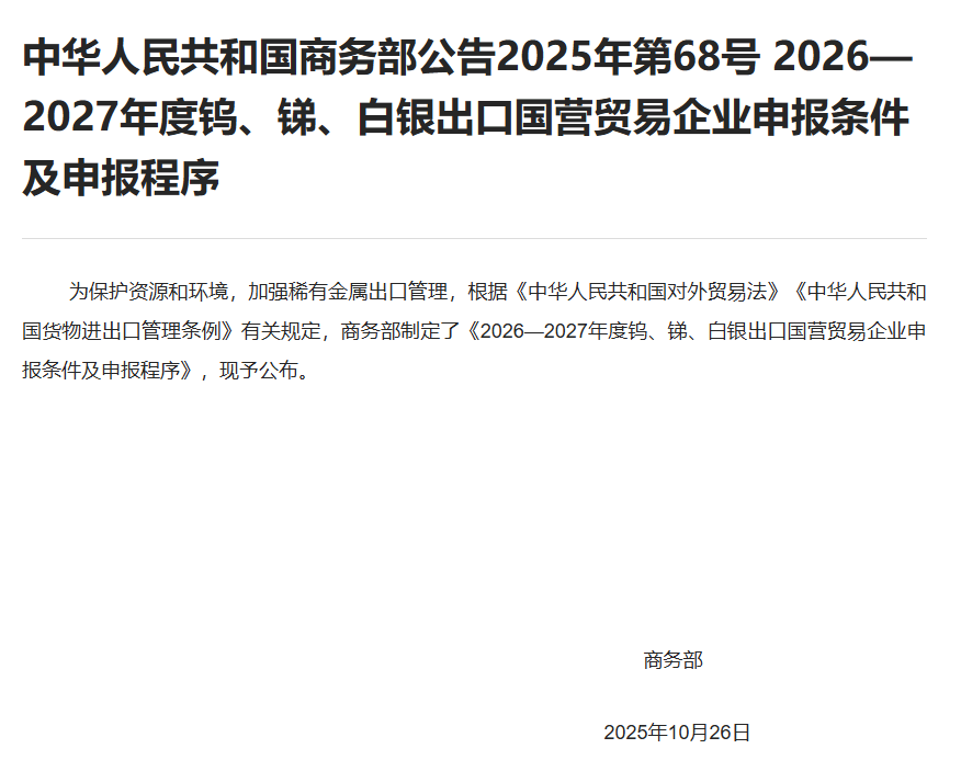 中国将于2026年1月开始实施新的白银出口许可证制度。市场参与者普遍解读,此举旨在保护其白银库存,这些库存是其电池和太阳能电池板等产品的重要来源,可能意味着未来中国白银出口将受到更严格的管控,甚至出现出口配额缩减的情况。
