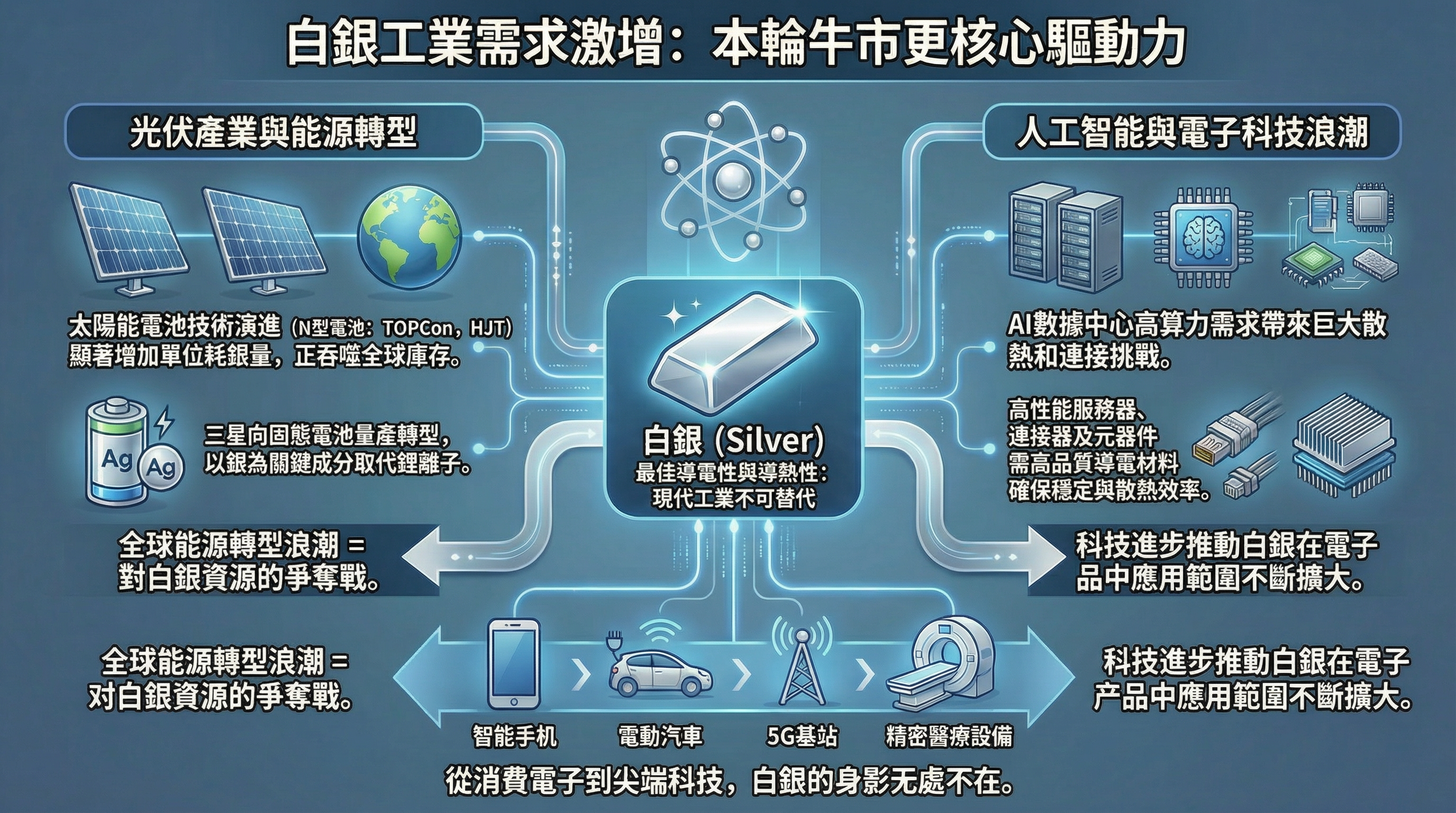 金融属性之外,工业需求的激增是本轮白银牛市更核心的驱动力。白银是自然界中导电性和导热性最好的金属。这一物理特性决定了白银在现代工业中的不可替代地位。
