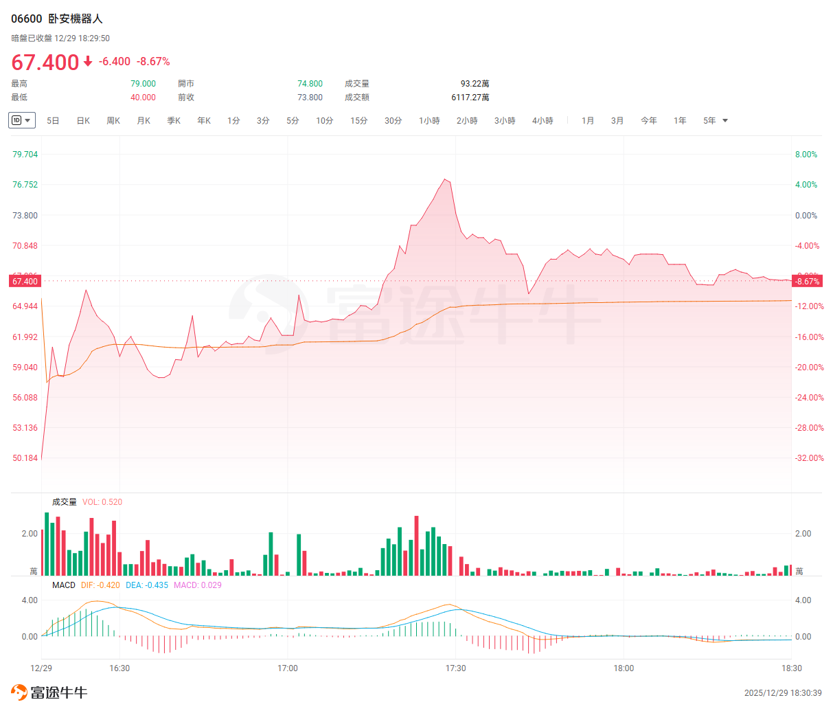 富途资讯12月29日消息,$卧安机器人 (06600.HK)$今日暗盘收跌8.67%,报67.4港元,成交额超6117万港元,每手100股,不计手续费,一手蚀640港元。