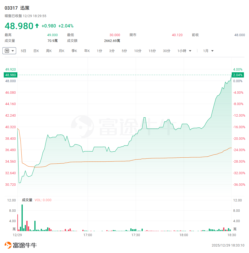 富途资讯12月29日消息, $迅策 (03317.HK)$ 今日暗盘收涨2.04%,报48.98港元,总市值157.96亿港元。