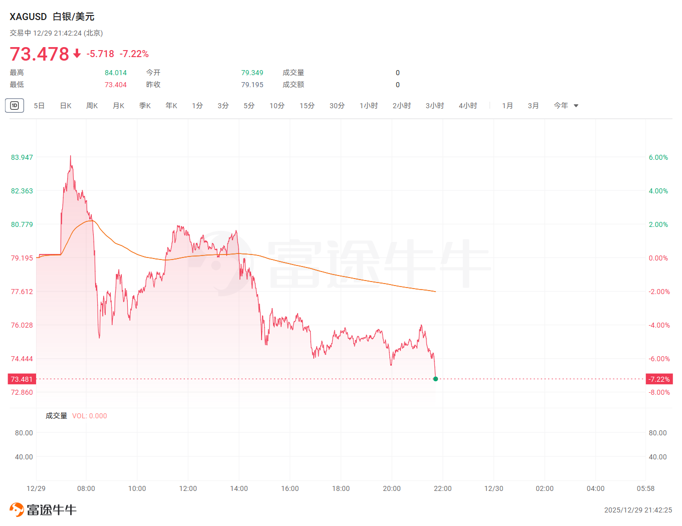 周一(12月29日),现货白银剧烈动荡,早盘一度大涨6%之后出现跳水,现跌超7%至73.478美元/盎司,而就在上周五曾创下单日最大美元涨幅纪录。