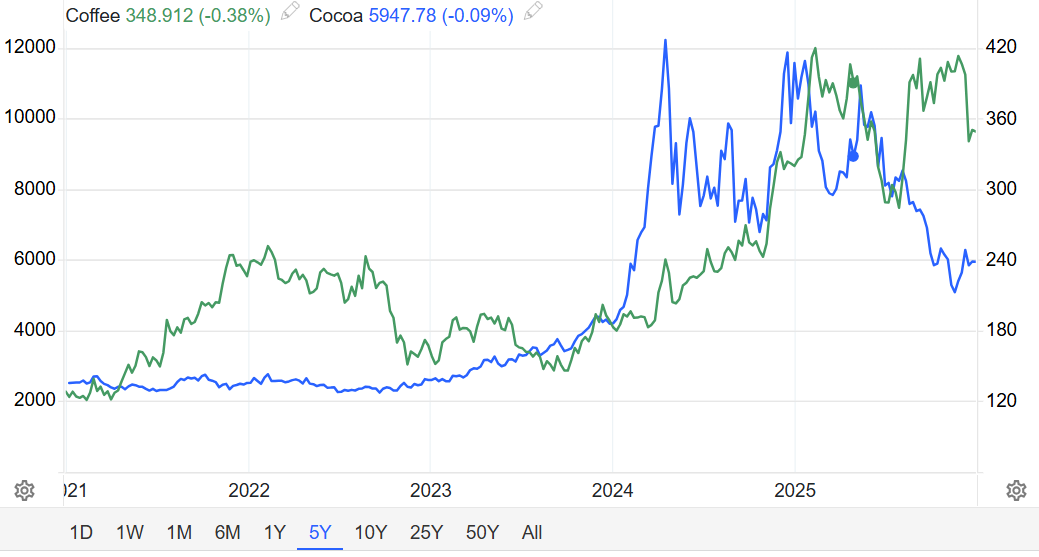 2025年回顾:继2024年底触及每吨1.2万美元的历史峰值后,2025年价格出现大幅回撤,但整体仍维持在结构性高位。年初纽约可可期货在9000美元附近博弈,但随着国际可可组织(ICCO)预警供需缺口收窄及西非产区(科特迪瓦和加纳)产量恢复预期增强,价格一路下行,年底回落至约6000美元/吨区间。