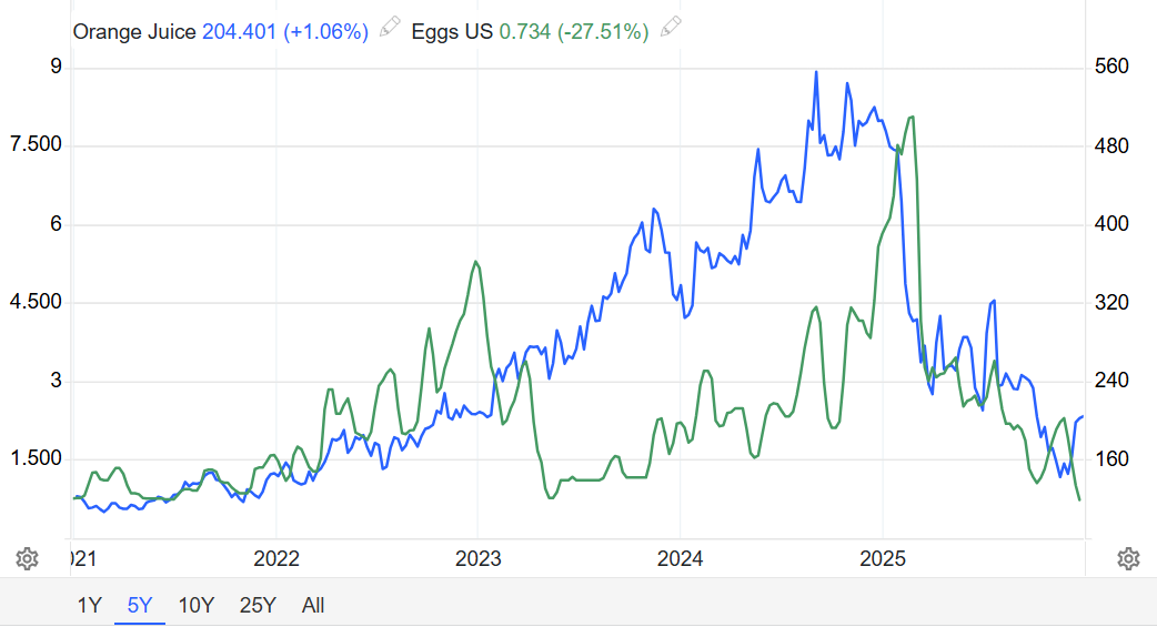 2025年回顾:这种大宗商品经历了2024年的历史性飙涨后,今年也进行了深度回调。美国鸡蛋价格大幅下跌,年初创下历史新高,随后随着季节性需求下降,以及禽流感新发病例减少,新建围栏速度快于预期,批发价格率先大幅下跌。美国鸡蛋价格跌破每打 0.99 美元,降至自 2023 年 5 月以来的最低水平。橙汁也逆转了去年的涨势,年初出现大幅回调;随后,巴西的橙子产量预期持续改善,价格势头继续向下;临近年底,价格出现反弹。
