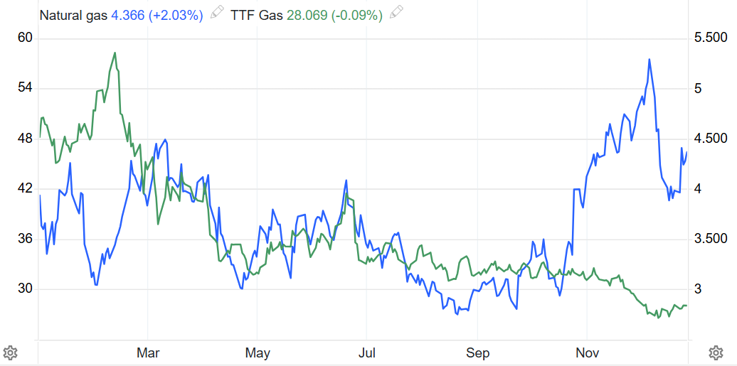 第四季度,市场演变为剧烈的戏剧性分化。美国受拉尼娜现象及北极寒流影响,采暖需求激增导致天然气价格在12月初飙升至5美元的三年高位,表现极度强势。与此同时,欧洲市场却因供应渠道多元化、工业需求持续疲软以及地缘局势缓和,TTF价格出现“阴跌不止”的走势。