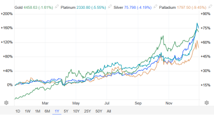 2025年回顾:从年度表现看,贵金属今年可谓“史诗级行情”。黄金年内累计上涨约70%,白银涨幅更是超过160%,双双有望创下1979年以来最佳年度表现,延续了2024年的强劲表现。推动涨势的因素包括各国央行持续买入、交易型基金(ETF)资金流入,以及美联储年内连续三次降息。较低的利率环境削弱了无息资产的机会成本,市场还押注2026年可能进一步降息。除了金银,铂金与钯金今年涨势也疯狂,涨幅分别达到160%、100%。