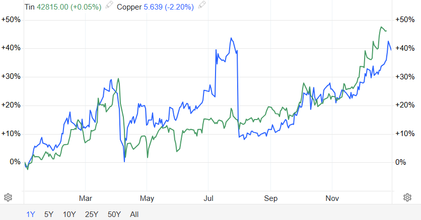 2025年回顾:全球工业金属市场在“新旧动能转换”与“供应区域化”的交织中呈现出极端分化的格局。以铜与锡为代表的品种领衔开启了“算力与电力周期”。铜价在2025年频频创下历史新高,单吨一度突破12700美元。其核心逻辑已从传统建筑业转向AI数据中心扩展与全球电网升级带来的结构性刚需,叠加智利、秘鲁等矿端供应频发不可抗力,以及贸易关税引发的跨区库存挤仓,使得铜成为了年度最具统治力的金属。锡则紧随半导体行业的强劲复苏,在缅甸与印尼供应不确定性的助推下,价格中枢大幅上移,展现出极强的向上弹性。