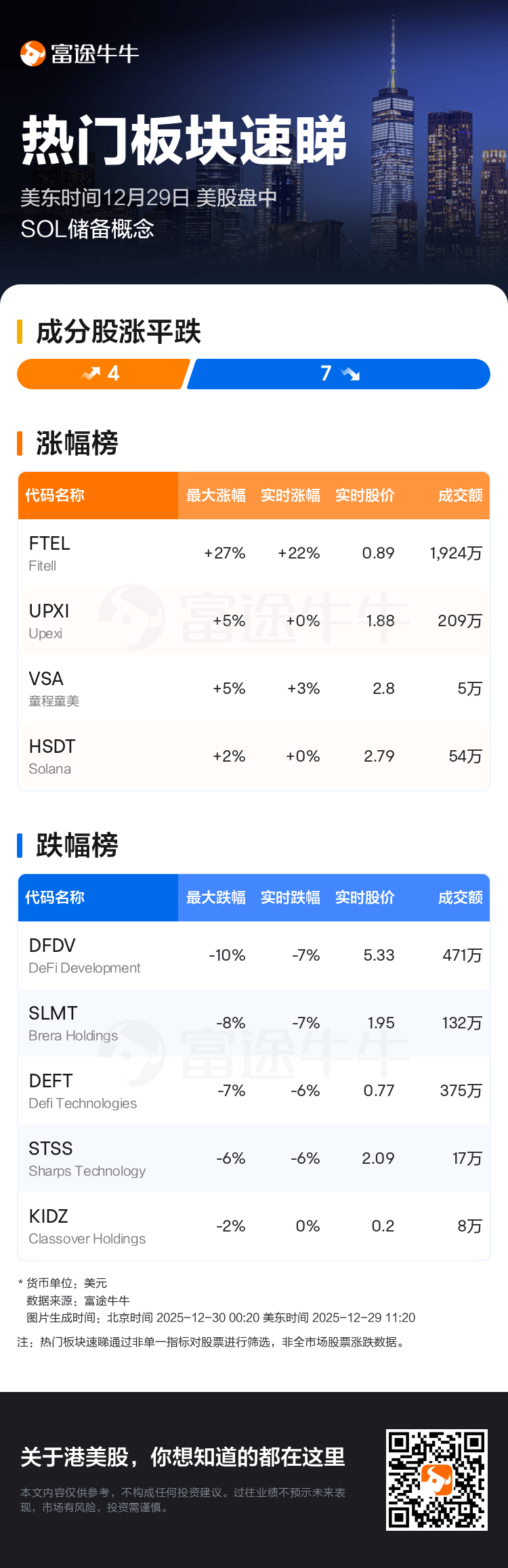 美东时间12月29日报道,今日美股盘中$SOL储备概念 (LIST23797.US)$走弱,截至发稿,板块中4只成份股上涨,7只成份股下跌,DeFi Development领跌板块。