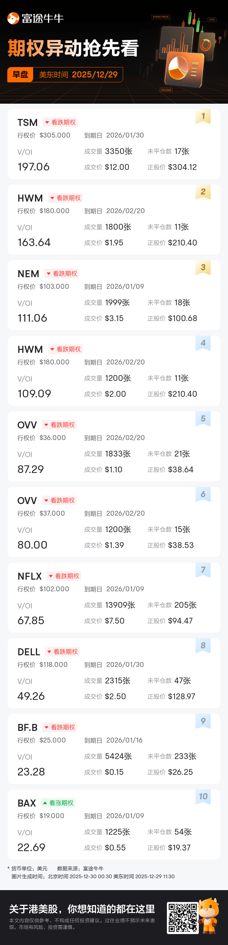 若在对应时段有超过3笔V/OI≥10的交易,将在美东时间11:30、13:30和16:30各生成一篇期权异动资讯。