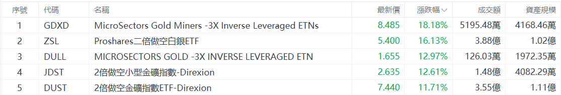 $2倍做空金矿指数ETF-Direxion(DUST.US)$ 升11.71%,成交额3.57亿美元。