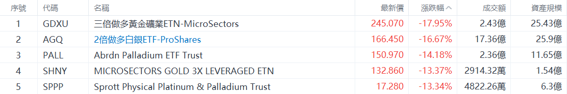 $2倍做多白银ETF-ProShares(AGQ.US)$ 跌16.67%,成交额17.36亿美元。
