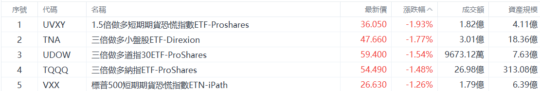 $1.5倍做多短期期货恐慌指数ETF-Proshares(UVXY.US)$ 跌1.93%,成交额1.82亿美元。