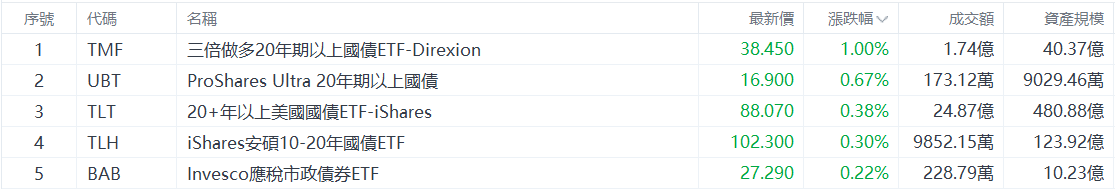 $20+年以上美国国债ETF-iShares(TLT.US)$ 升0.38%,成交额24.87亿美元。
