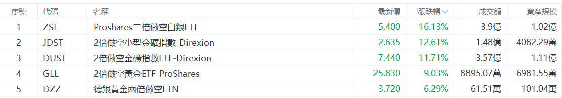 $Proshares二倍做空白银ETF(ZSL.US)$ 升16.13%,成交额3.9亿美元。