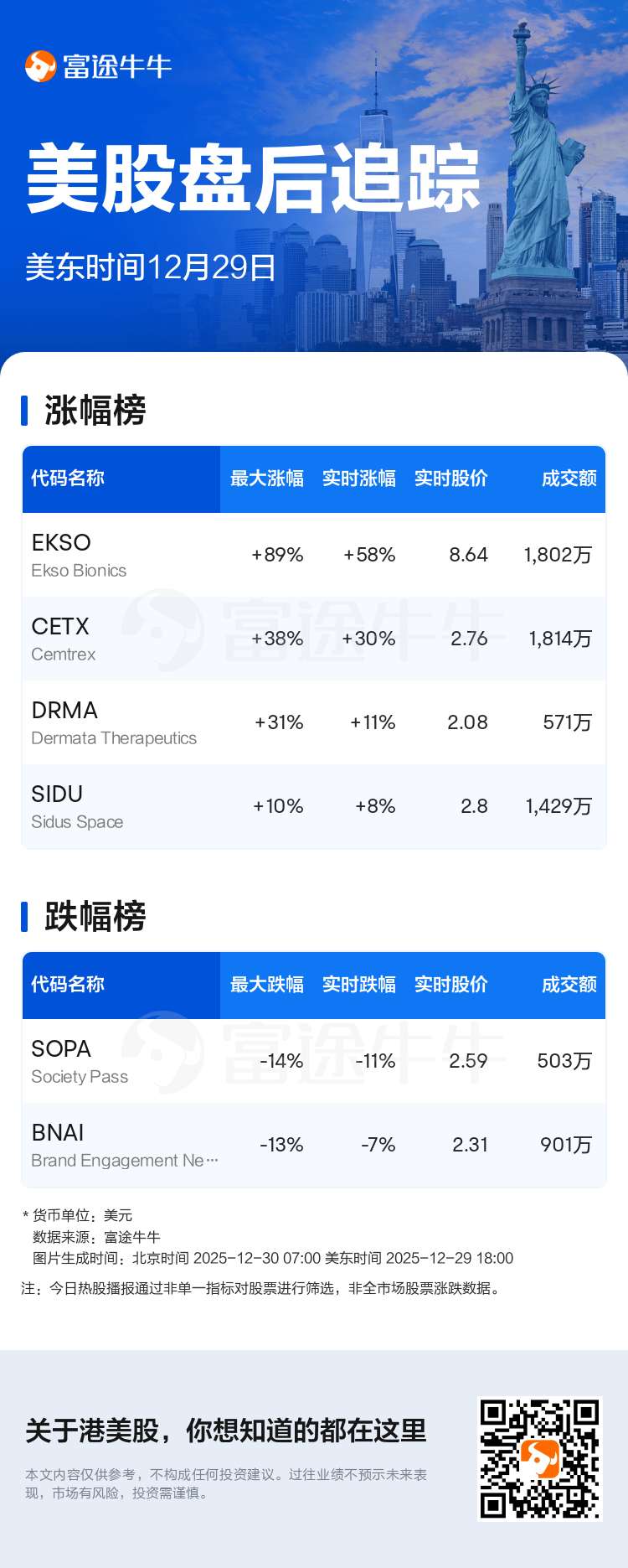 美东时间12月29日报道,以下为今日美股盘后热门个股。