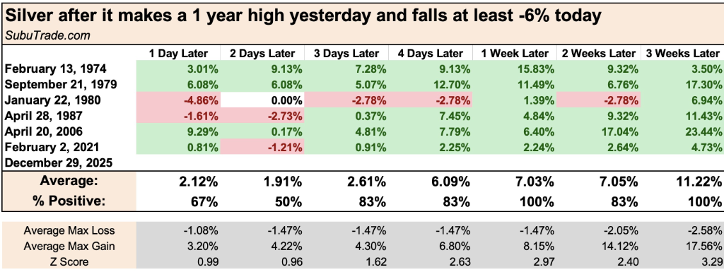 值得注意的是,即便经历了如此剧烈的下跌,金银价格也只是回到数日前的水平,从时间维度看,更像是对过热行情的一次急刹车,而非趋势性反转。据统计,白银价格从一年高点下跌超6%后,历史上6次均在一周内反弹上涨。
