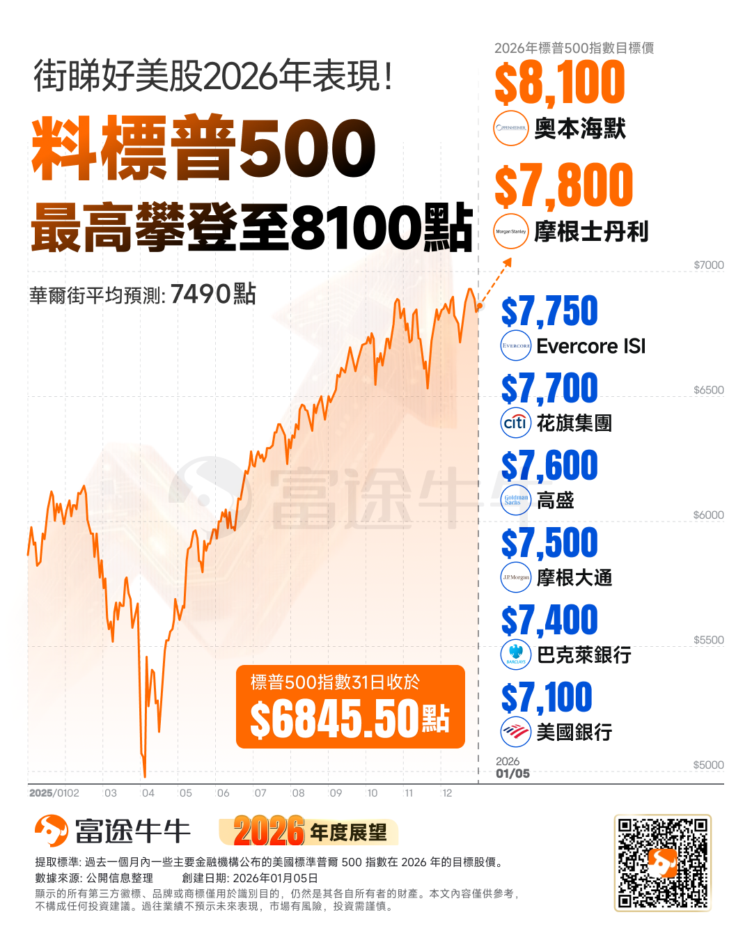 2025年美股在磕磕绊绊中收官,标普500指数全年涨了约16%——这已经是2023年以来的第三年上涨。进入2026年,华尔街突然变得空前乐观,机构们对标普500的目标价齐刷刷定在7100-8100点,其中奥本海默给出的8100点最高预期,意味着还有18%的上涨空间。