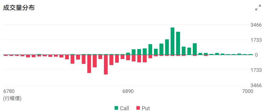今日到期的 $标普500指数 (.SPX.US)$ 期权成交量分布:Call单与Put单分布存在分歧,Put单峰值在6870点,Call单峰值在6930点。