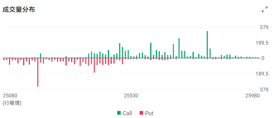 今日到期的 $纳斯达克100指数 (.NDX.US)$ 期权成交量分布:Call单峰值为25800,Put单峰值在25200点。