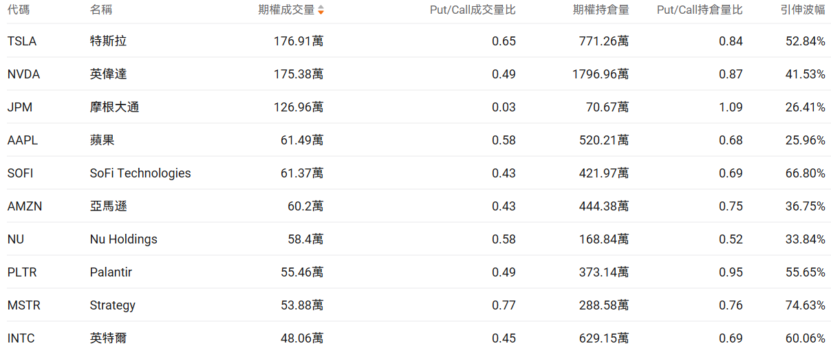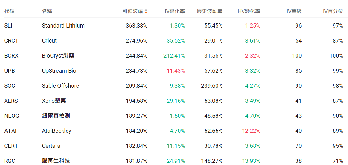 美股期权波动率排行榜前十(标的市值>100亿美元,且期权成交量>10万张)