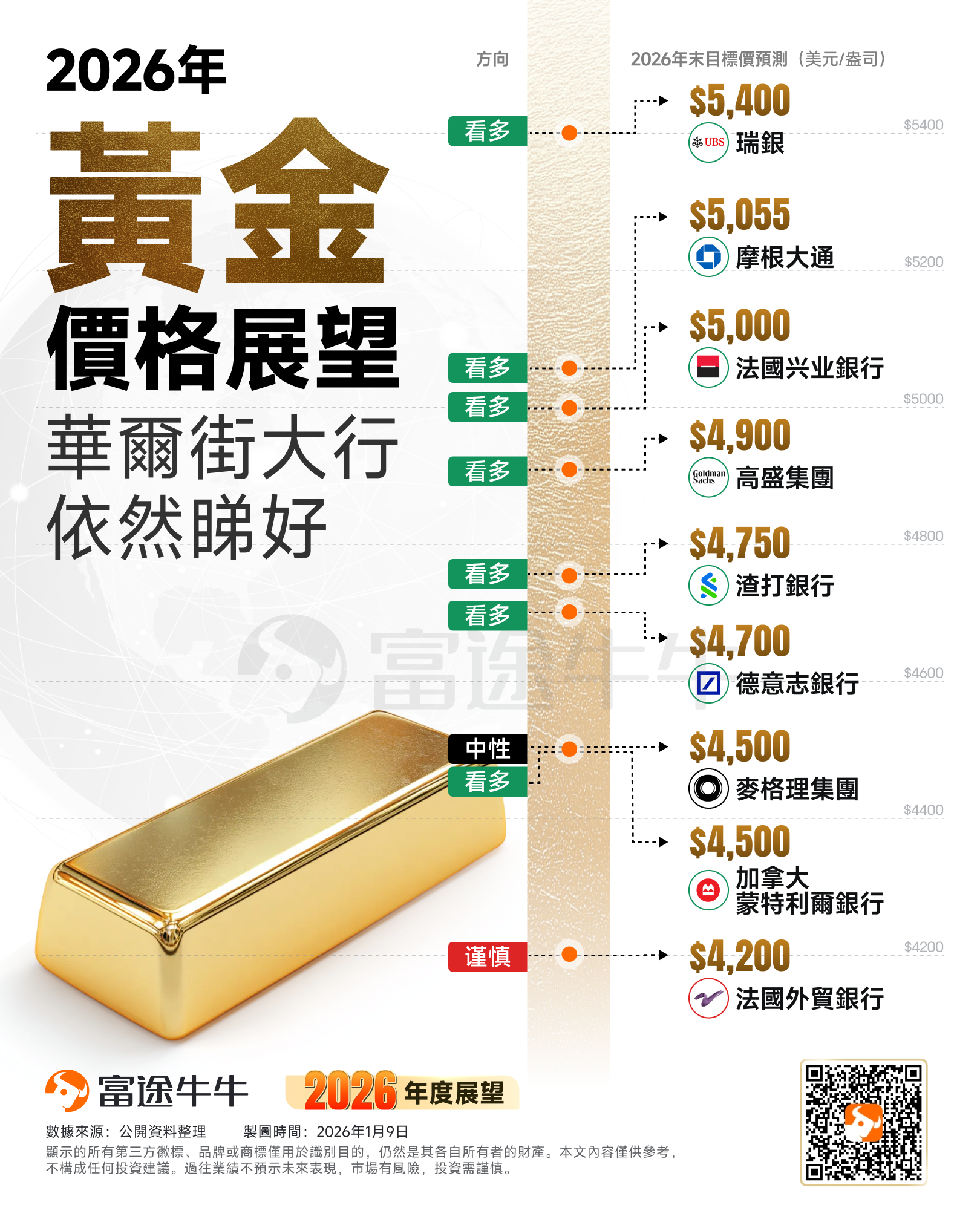 摩根大通认为央行与机构投资者对通胀/货币不确定性对冲需求增强,预测金价到2026Q4有望达到$5,055/盎司。