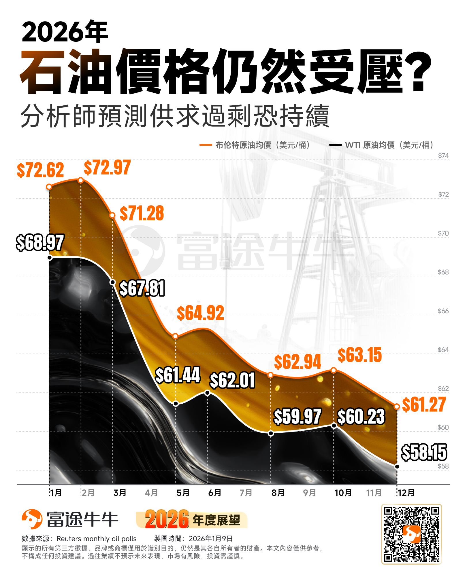 根据路透12月对34位经济学家和分析师进行的调查预测,2026年布伦特原油均价将为每桶61.27美元,低于11月份预测的每桶62.23美元。WTI原油均价预计为每桶58.15美元,低于11月份预测的每桶59.00美元。